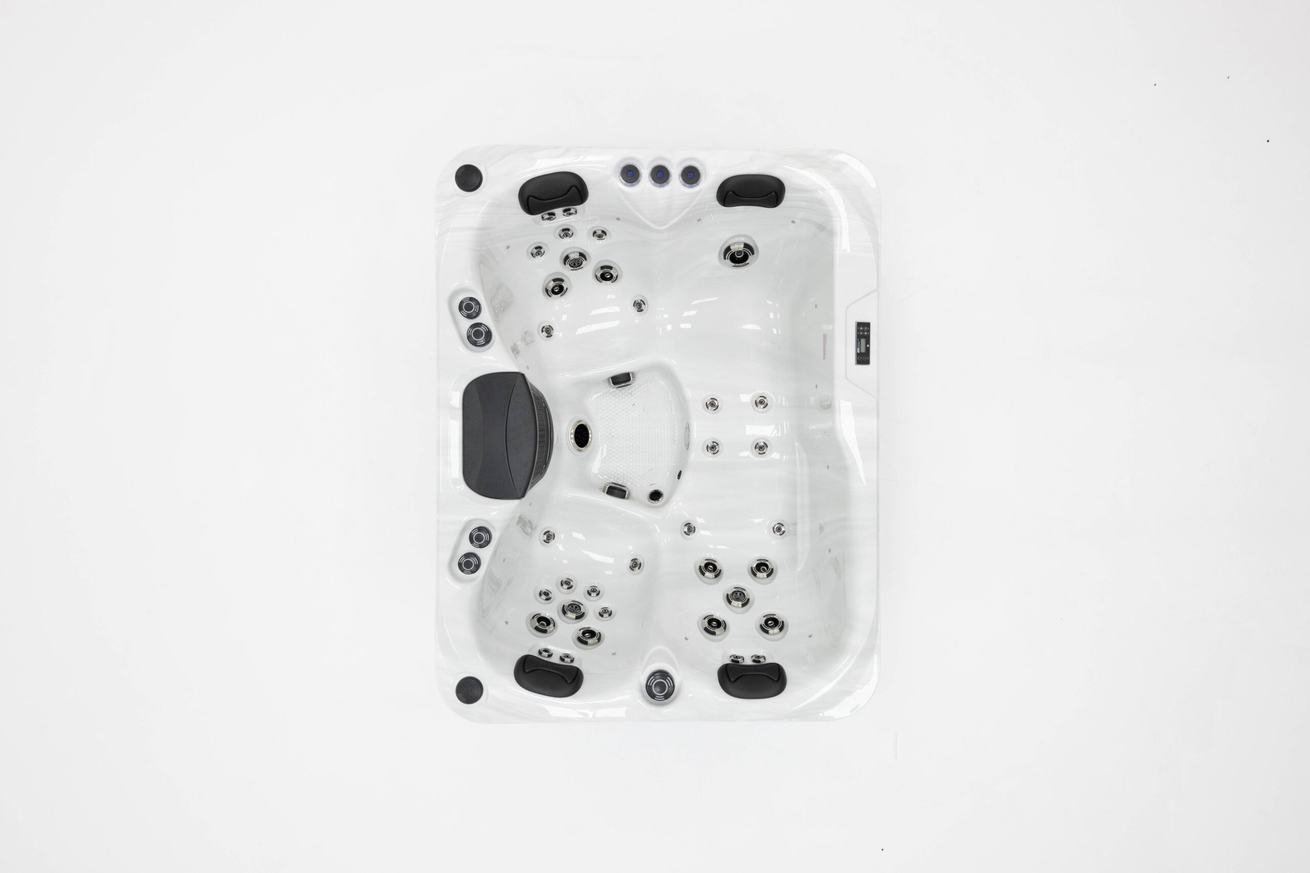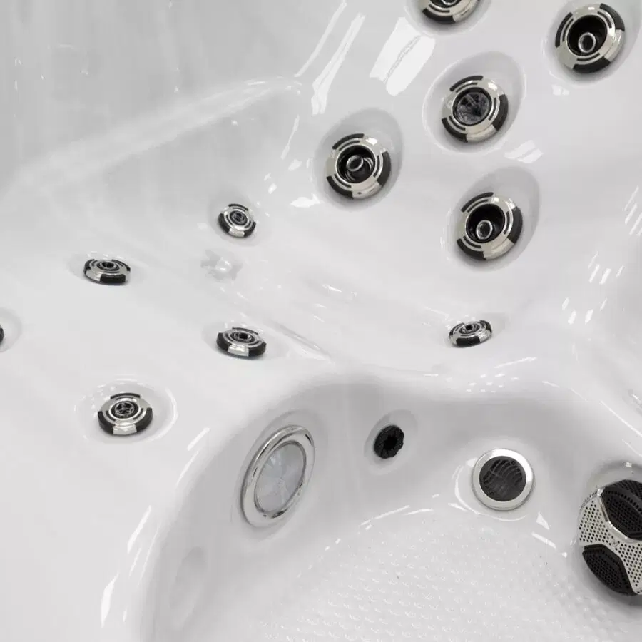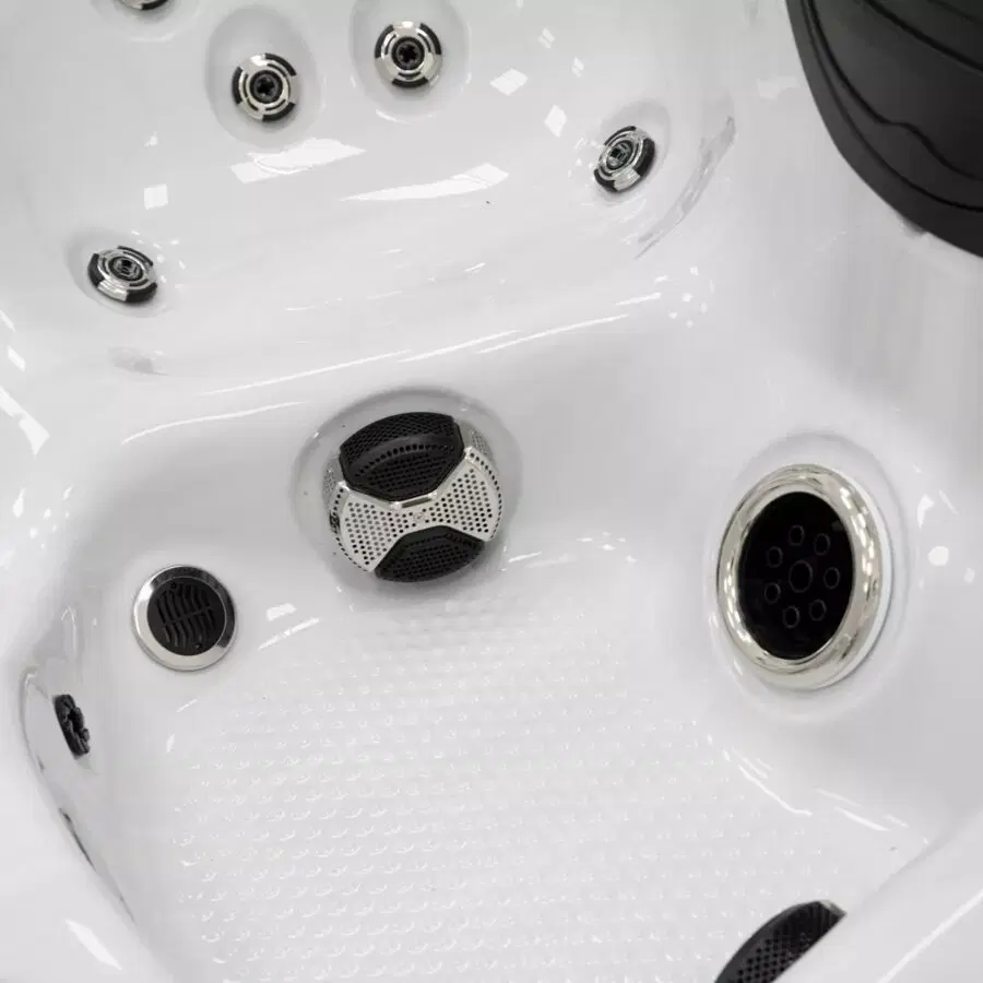 Ponadto, nasze jacuzzi zostało wyposażone w grzałkę o mocy 2000W, skuteczny ozonator do oczyszczania wody oraz wbudowane audio z Bluetooth, umożliwiając Ci stworzenie własnej strefy relaksu idealnie dopasowanej do Twoich potrzeb. W pełni zabudowane dno wanny gwarantuje wygodę i stabilność, zapewniając bezpieczeństwo podczas użytkowania.